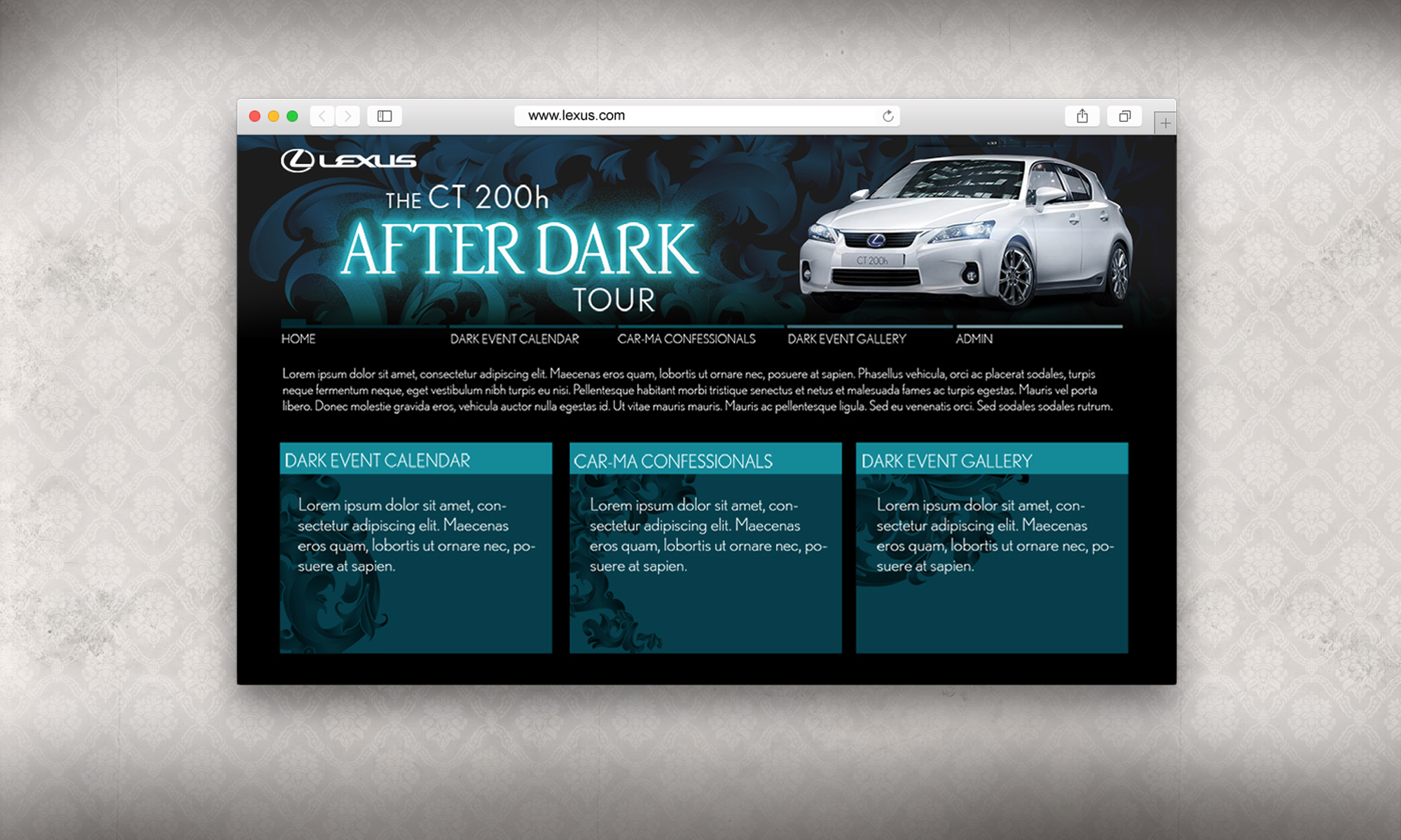 Previous Lexus owners were contacted to come out to test drive the new CT200h on a closed course. While driving the CT200h the drivers were videoed. These videos would be played on screens later in the evening at specially selected nightclubs. These nightclubs were branded with the After Dark look and feel and were private only events specifically for those who came out and test drove the CT200h.